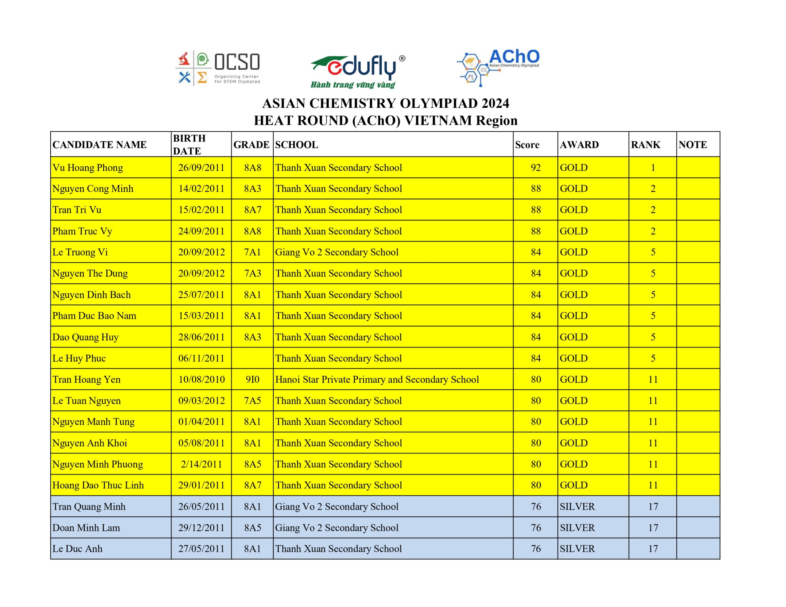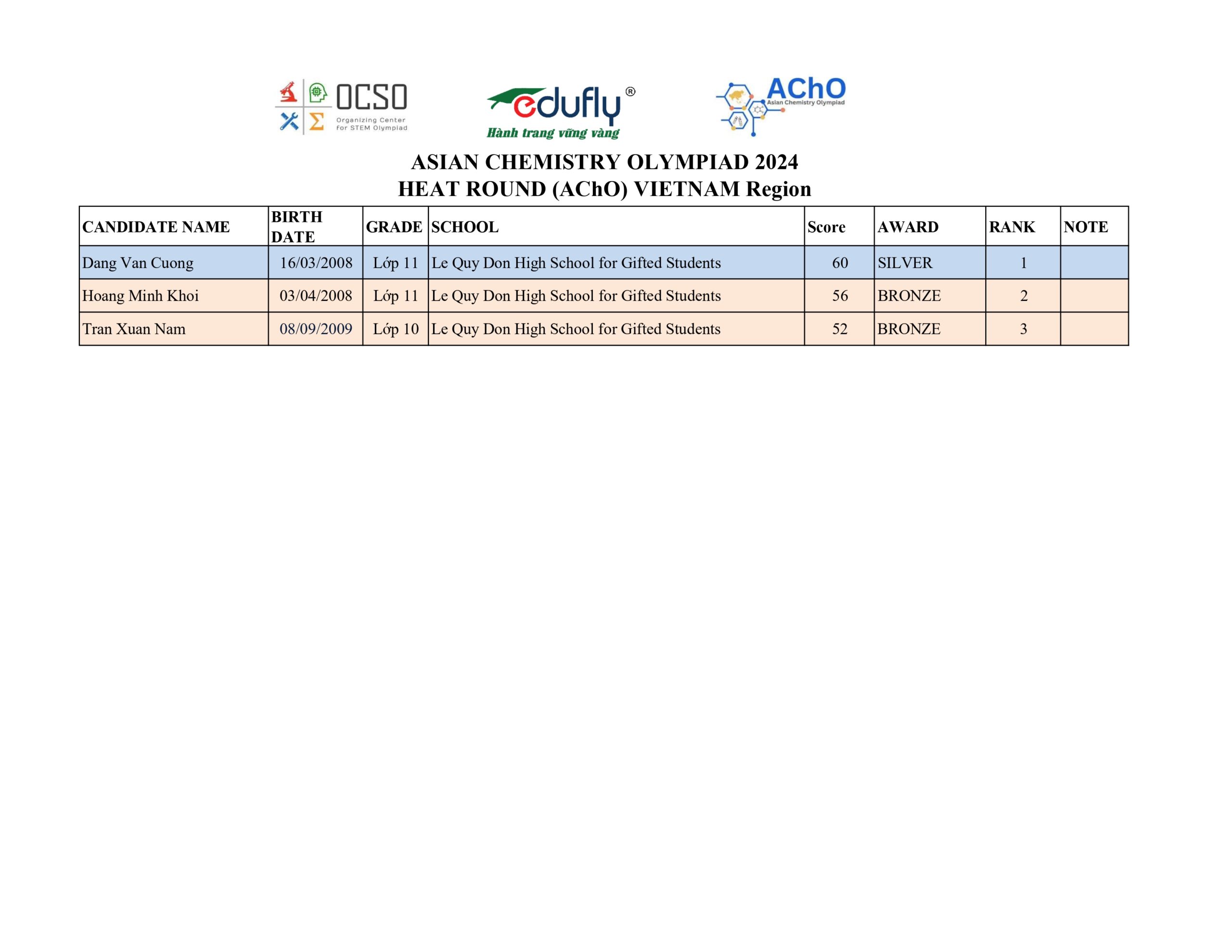 Kỳ thi Olympic Hoá học Châu Á AChO 2024 Vòng Quốc gia diễn ra Online vào ngày 08/12/2024 đã thu hút hơn 130 thi sinh tham dự, mặc dù thời gian ôn luyện ngắn nhưng thành tích của các em đã chứng tỏ được niềm yêu say Hoá học được nuôi dưỡng từ rất lâu.