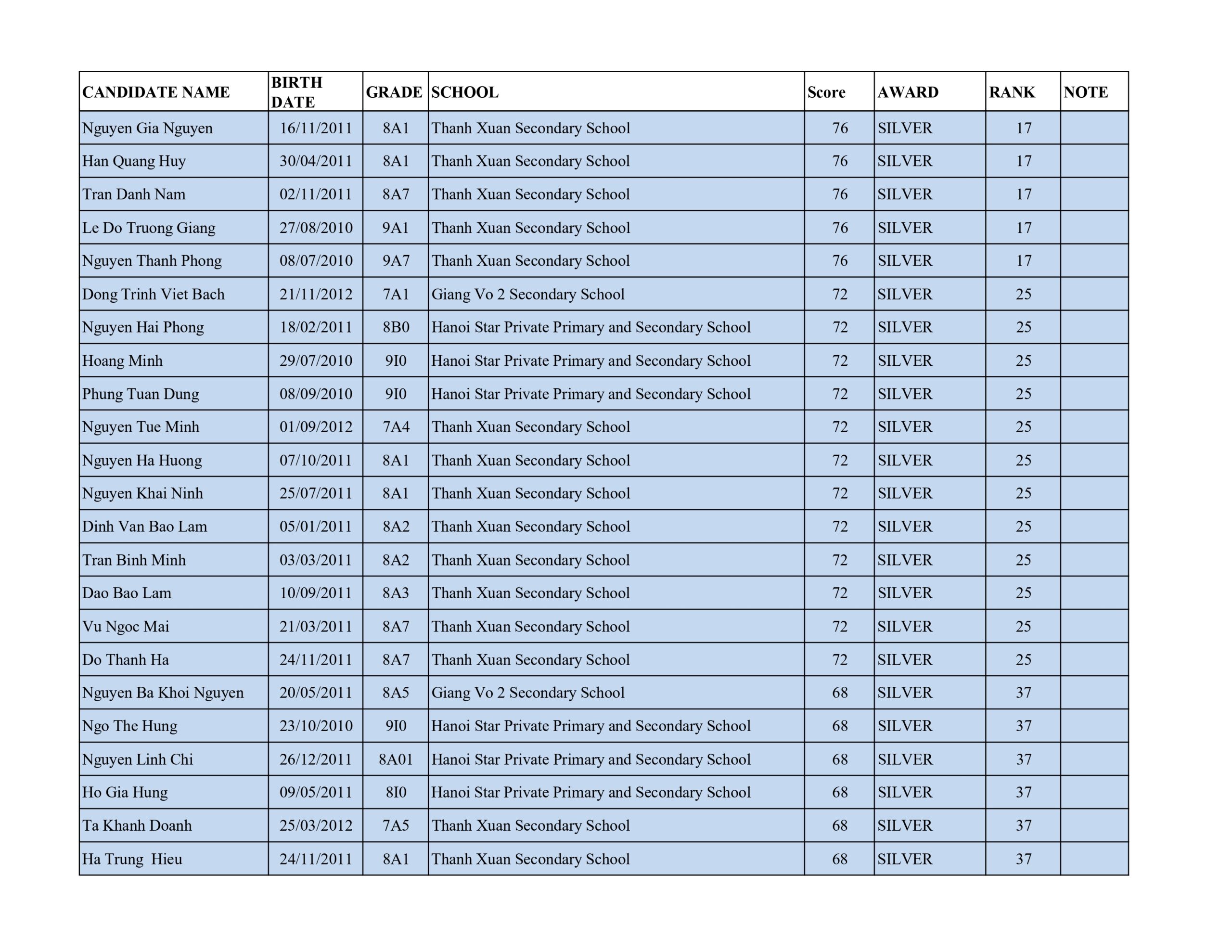 Bảng thành tích cấp độ B (Lớp 10 – 11 – 12)